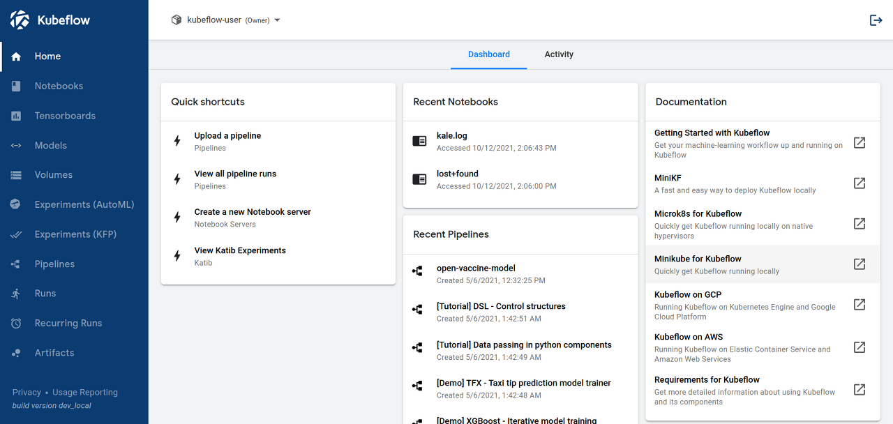 - Experiments (KFP): 실험용 Kuberflow Pipeline(KFP)을 사용할 수 있게 해준다.
