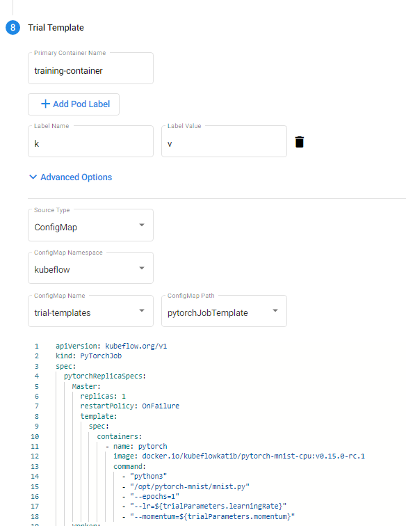 - 마지막으로, trial의 환경을 정해줄 수 있는 Trial Template이다. 이 메뉴를 활용하여, Trial에서 사용할 수 있는 도커 이미지나 하이퍼파라미터 설정, 리소스 제한 등을 정의할 수 있다. Template를 제공하기 때문에 해당 Template을 수정하는 구조로 실험을 진행할 수도 있다.