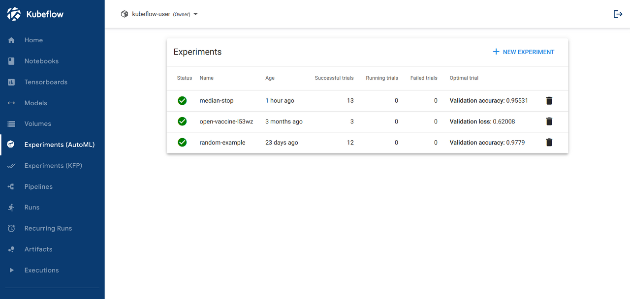 - Kubeflow 환경 하에서 Katlib은 Experiments(AutoML) 메뉴에서 사용 가능하다.