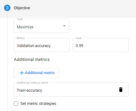 - 세 번째는, Objective이다. 모델 학습을 최적화하기 위한 최종목표를 정의 가능하다. Metric을 통해서, 여러개 Objective를 설정할 수 있고, 각 Metics에 대해, "Maximaze"와 "Minimize"를 정해, 탐색 목표를 정할 수 있다.