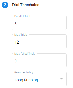 - Max failed Trials : 최대 몇 번까지 실패한 학습을 용인할지를 결정해 줌. Katlib의 수행 자동화 기능을 지원하기 위해 들어간 파라미터로, 실험 세팅의 실수 등의 이유로 정상적인 실험이 진행되지 않았지만, 인간이 바로 인지하지 못하는 경우 무의미한 실험들이 H/W를 점유하고 있을 수 있어서, 이러한 무의미한 실험등을 방지하기 위해, 최대 실패 횟수를 정해서, 이를 초과한 실험 실패가 발생했을 시, 실험을 중단함.