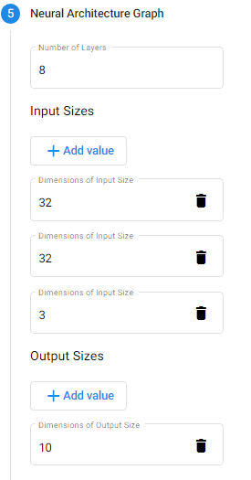 - 다섯 번째는, Neural Architecture Graph는 네트워크의 구성을 정의하기 위한, Input, Output 사이즈 및 Layer 갯수등을 지정한다.