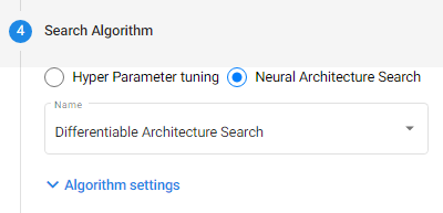 - 네 번째는, Search Algorithm이다. 모델 탐색 과정의 알고리즘을 선택할 수 있다. 크게 Hyper Parameter tuning과 neural Architecture Search에 대한 알고리즘을 제공한다.