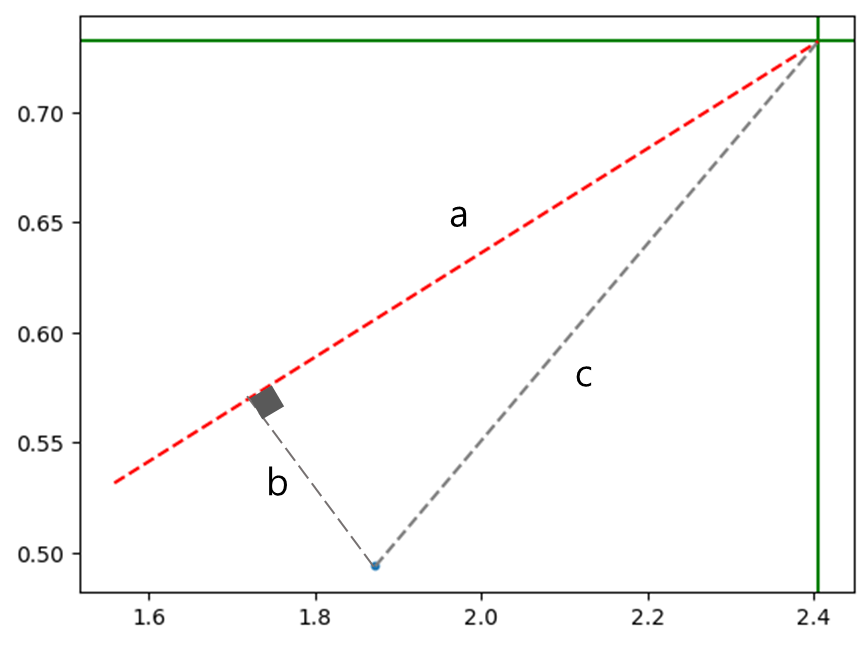 아래의 그림에서 c는 데이터 포인트와 평균 간의 거리기 때문에 고정이다. 피타고라스 정리에 의해서 c가 고정되어 있을때, b(원 데이터와의 거리)가 최소인 값을 구하려면 a가 최대가 되어야한다.