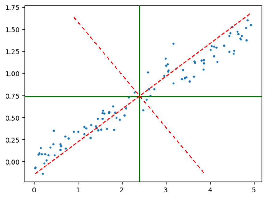 이때, 우리는 분산(새로운 원점인 기존 데이터들의 평균부터 각 데이터까지의 거리의 합)이 최대가 되는 직선을 구할 것이다.)