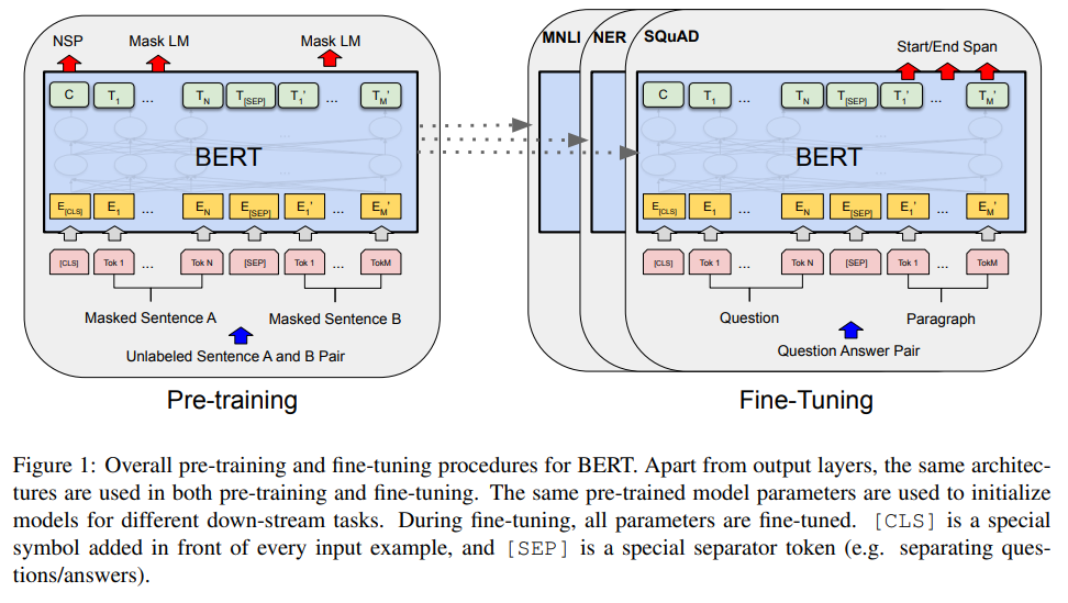 - BERT는 기존의 Fine-tuning 방법들(특히 GPT-1)처럼 2개의 step으로 구성된다. (1) pre-training (2) fine-tuning