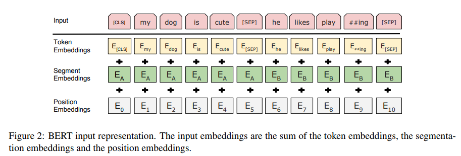 아래 그림은 BERT의 input representations를 나타내는데, token 자체의 embeddings와 어느 문장에 속하는지를 나타내주는 Segment embeddings, token의 문장 내 위치를 가르쳐주는 Position embeddings로 구성되어 있다.