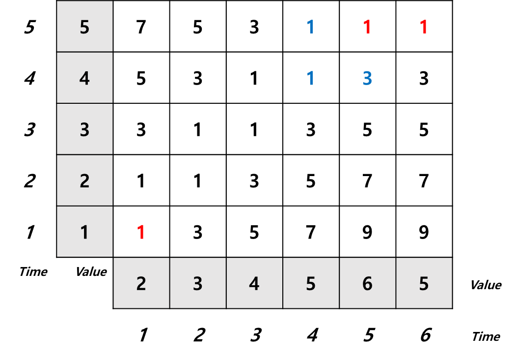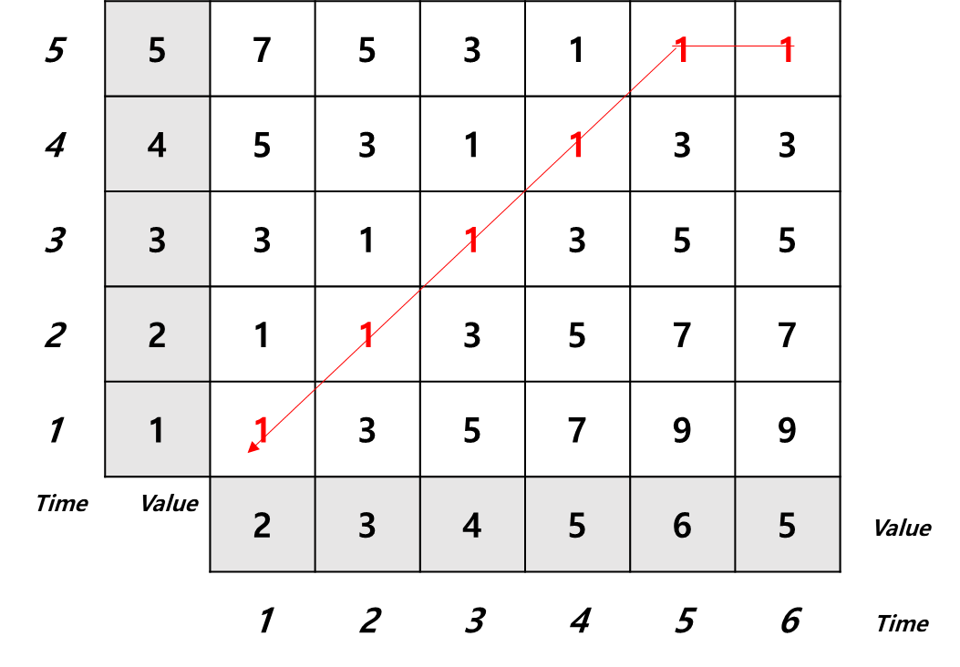 이를 그림으로 표현하면 DTW를 구하는 방식은 아래와 같다. (편의를 위해 맨해튼 거리를 이용한다.)