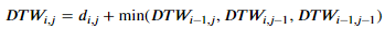 dtw[i, j] = cost + min(dtw[i-1, j], dtw[i, j-1], dtw[i-1, j-1])
