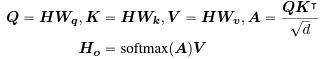 - self-attention은 아래와 같은 수식을 통해 구해진다. Output hidden vector인 \(H_o\)를 구하기 위해, Query(Q)와 Key(K)를 통해 Attention(A)을 구하고, Attention을 Normalize 한 후 Value(V)에 곱한다.