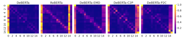 → RoBERTa는 diagonal line이 두드러지지만, DeBERTa는 그렇지 않다. 이것은 EMD의 영향인 것으로 확인된다.(DeBERTa가 다른 단어를 골고루 본다는 뜻인 것 같다.)