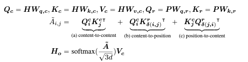 → 주의해야 할 점은, "position-to-content"에 \(\delta(j, i)\)가 사용되었다는 점인데, 이것은 "position-to-content"를 구할 때, 사용되는 content가 j번째 content이기 때문이다.