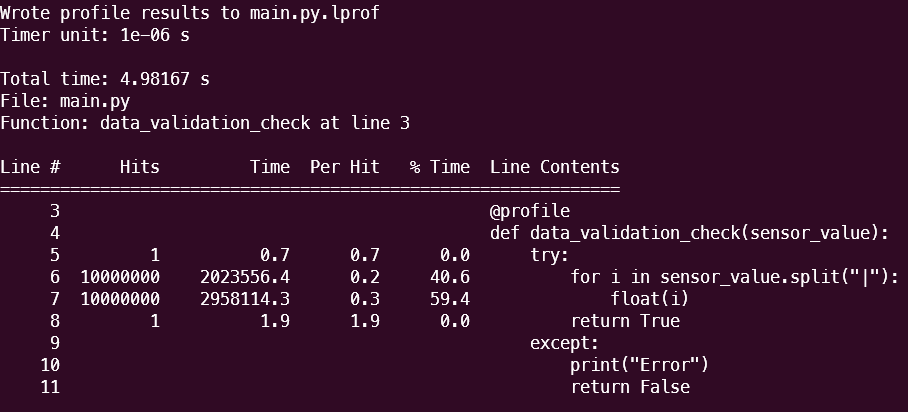 | Timer unit: 1e-06 s Total time: 4.83922 s File: main.py Function: data_validation_check at line 3 Line # Hits Time Per Hit % Time Line Contents ============================================================== 3 @profile 4 def data_validation_check(sensor_value): 5 1 0.5 0.5 0.0 try: 6 10000000 1970775.1 0.2 40.7 for i in sensor_value.split("|"): 7 10000000 2868439.0 0.3 59.3 float(i) 8 1 1.5 1.5 0.0 return True 9 except: 10 print("Error") 11 return False Total time: 1.48381 s File: main.py Function: data_preprocessing at line 13 Line # Hits Time Per Hit % Time Line Contents ============================================================== 13 @profile 14 def data_preprocessing(sensor_value): 15 1 369882.5 369882.5 24.9 sensor_value = sensor_value.split("|") 16 1 1113930.3 1113930.3 75.1 sensor_value = list(map(float, sensor_value)) 17 18 1 1.3 1.3 0.0 return sensor_value Total time: 2.66128 s File: main.py Function: outlier_remove at line 20 Line # Hits Time Per Hit % Time Line Contents ============================================================== 20 @profile 21 def outlier_remove(sensor_value): 22 1 337871.3 337871.3 12.7 data_mean = np.mean(sensor_value) 23 1 366792.1 366792.1 13.8 data_std = np.std(sensor_value) 24 25 1 5.7 5.7 0.0 lower_bound = data_mean - 3 * data_std 26 1 10.6 10.6 0.0 upper_bound = data_mean + 3 * data_std 27 28 1 1956595.8 1956595.8 73.5 sensor_value = [i for i in sensor_value if lower_bound < i and upper_bound > i] 29 1 0.7 0.7 0.0 return sensor_value Total time: 0.415683 s File: main.py Function: data_sort at line 31 Line # Hits Time Per Hit % Time Line Contents ============================================================== 31 @profile 32 def data_sort(sensor_value): 33 1 415683.2 415683.2 100.0 return np.sort(sensor_value) Total time: 0.003097 s File: main.py Function: data_cal_half_avg at line 35 Line # Hits Time Per Hit % Time Line Contents ============================================================== 35 @profile 36 def data_cal_half_avg(sensor_value): 37 1 3097.0 3097.0 100.0 return np.mean(sensor_value[int(len(sensor_value) * 0.5):]) |