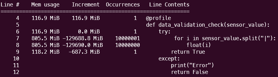 | ... Filename: main.py Line # Mem usage Increment Occurrences Line Contents ============================================================= 14 118.7 MiB 118.7 MiB 1 @profile 15 def data_preprocessing(sensor_value): 16 807.1 MiB 688.3 MiB 1 sensor_value = sensor_value.split("|") 17 501.2 MiB -305.8 MiB 1 sensor_value = list(map(float, sensor_value)) 18 19 501.2 MiB 0.0 MiB 1 return sensor_value Filename: main.py Line # Mem usage Increment Occurrences Line Contents ============================================================= 21 501.2 MiB 501.2 MiB 1 @profile 22 def outlier_remove(sensor_value): 23 501.3 MiB 0.1 MiB 1 data_mean = np.mean(sensor_value) 24 501.3 MiB 0.0 MiB 1 data_std = np.std(sensor_value) 25 26 501.3 MiB 0.0 MiB 1 lower_bound = data_mean - 3 * data_std 27 501.3 MiB 0.0 MiB 1 upper_bound = data_mean + 3 * data_std 28 29 579.9 MiB 78.5 MiB 10000003 sensor_value = [i for i in sensor_value if lower_bound < i and upper_bound > i] 30 579.9 MiB 0.0 MiB 1 return sensor_value Filename: main.py Line # Mem usage Increment Occurrences Line Contents ============================================================= 32 503.5 MiB 503.5 MiB 1 @profile 33 def data_sort(sensor_value): 34 579.9 MiB 76.3 MiB 1 return np.sort(sensor_value) Filename: main.py Line # Mem usage Increment Occurrences Line Contents ============================================================= 36 197.5 MiB 197.5 MiB 1 @profile 37 def data_cal_half_avg(sensor_value): 38 197.5 MiB 0.0 MiB 1 return np.mean(sensor_value[int(len(sensor_value) * 0.5):]) 7499999.5 mprof: Sampling memory every 0.1s running new process running as a Python program... |