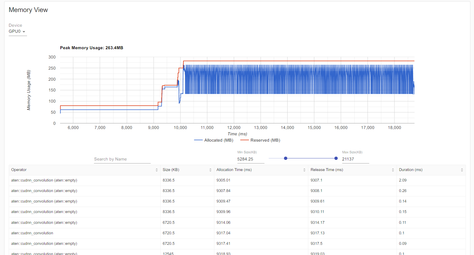 - Memory : 실행 시간에 따른 Memory 사용 추이를 보여준다. 각 연산마다 할당한 메모리와, Allocation Time과 Release Time, Duration을 보여준다. 코드 실행에 사용한 H/W 별로 볼 수 있다. (다만, 해당 UI에서 Memory를 많이 사용하는지, Chrome이 계속 죽는다.)