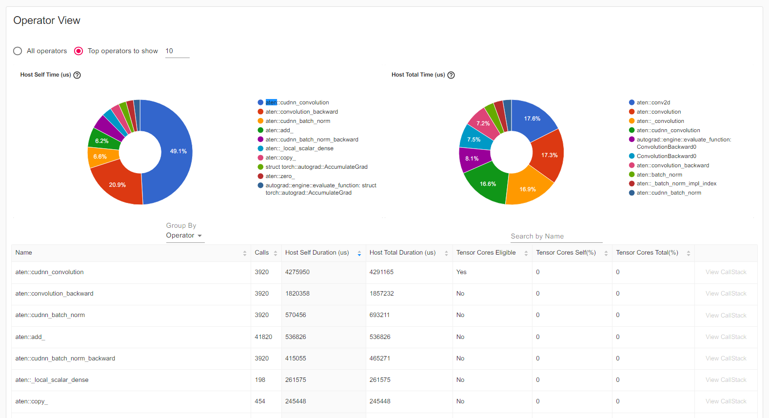 - Operator : 연산에 대한 profiling 결과를 보여준다. torch profiling 결과를 터미널에서 출력하였을 때, 보여주던 결과를 그대로 보여준다고 생각하면 된다. 추가적으로 Tensor Cores Eligible 옵션이 있는데, 해당 연산이 GPU를 사용할 수 있는지에 대한 가능 여부를 표시한 것이다. Group By 조건을 바꾸면, input shape도 볼 수 있다.