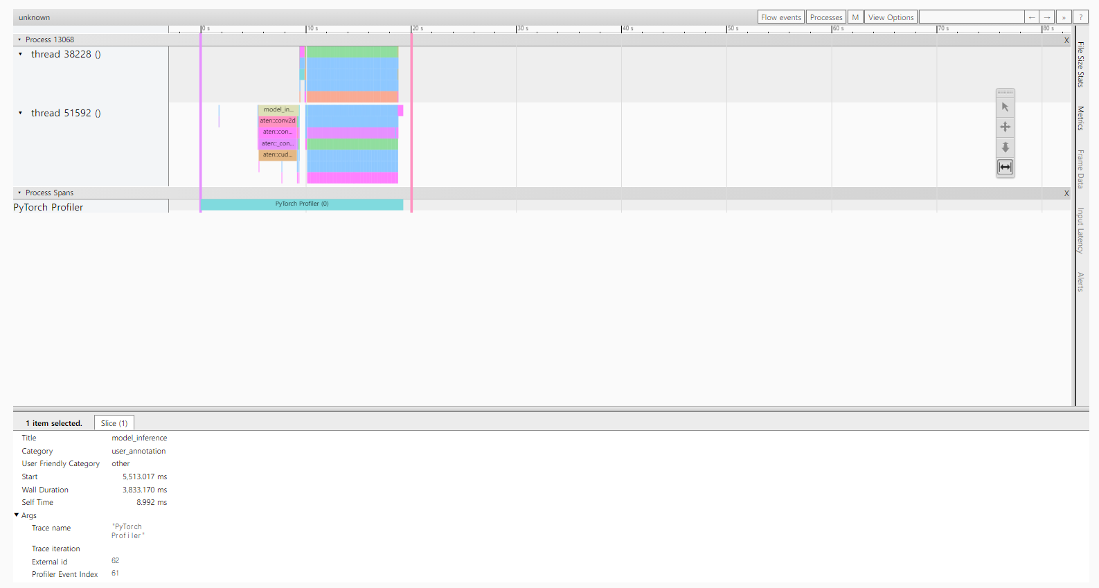 - Trace : 함수 및 연산의 실행 시간을 시간 경과에 따라 그래프 형태로 표시한다. 해당 코드의 실행에 사용된 Process와 그 안의 Thread의 동작을 확인 할 수 있다. (사실 이 UI는 torch profiler의 chrome tracing 기능으로도 볼 수 있다.)