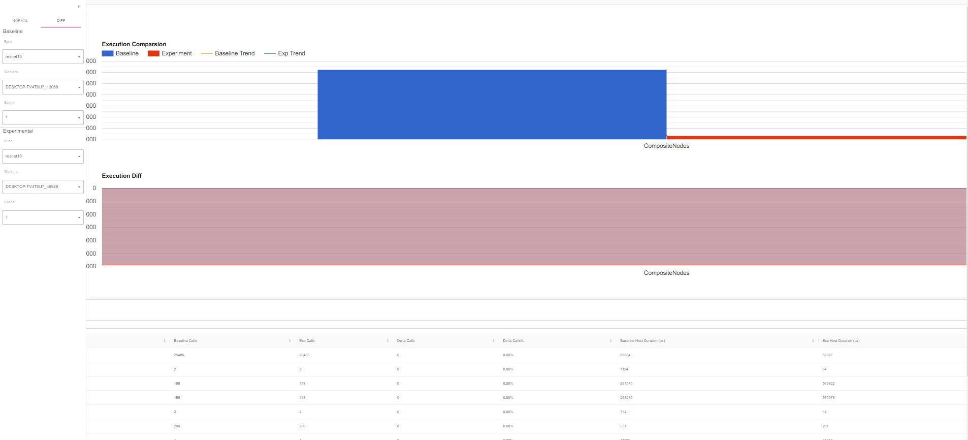 - Tensorboard를 통한 torch profiler 시각화의 가장 큰 장점이라고 할 수 있는 이력 간 비교 기능이다. Baseline의 log를 정한 뒤, 비교하고자 하는 log를 대입하면, 그 둘 간의 profiling 결과의 delta 값을 보여준다.