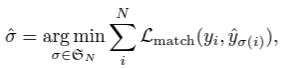 - y가 object들의 ground truth이고, y는 no object의 class도 가질 수 있다고 할 때, 예측과 ground truth 간의 bipartite matching을 갖는 조합을 찾기 위해 아래 식을 계산한다.
