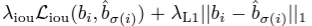 - 위의 식에서 box loss를 구성할 때, 기존 object detection의 box loss와 달리, loss의 scale에 대한 이슈가 있다. (기존에는 anchor에 대한 상대적 위치를 loss로 썼기 때문에) 이를 해결하기 위해, box loss로 주로 사용되는 L1 loss 뿐 아니라, IoU loss를 추가적으로 사용했다.