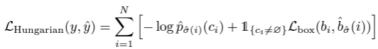 - 두 번째로, 앞서 구했던 전체 matching 쌍들에 대해 Hungarian loss function을 계산한다. 이때의 loss는 일반적인 object detection의 loss와 비슷하게, class prediction에 대한 loss와 box loss의 합이다.