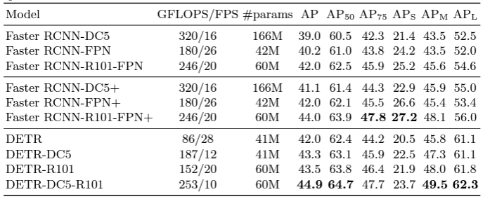 - 최근(그 당시) 모델들은 최초 Faster R-CNN에서 구조 변화를 통해 성능이 크게 향상되었음에도 불구하고, DETR은 그들과 필적할만한 좋은 성능을 보였다.