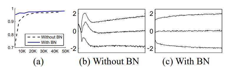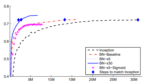 - 아래 그래프의 가로축은 training step이고 세로축은 validation accuracy이다. Batch Normalization을 이용하면 더 적은 step에서 좋은 성능을 발휘하는 것을 확인할 수 있다.