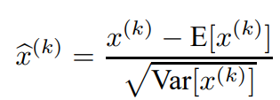 - 각 scalar feature들을 독립적으로 평균 0, 분산 1을 갖도록 normalize 한다. input들의 모든 dimension을 아래와 같이 normalization 한다.