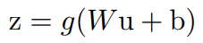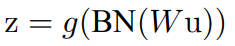 - Batch Normalization은 CNN에도 적용할 수 있는데, 아래와 같은 식이 있다고 할 때, (u: layer input, g: activation function, W: weight, b: bias) Convolutional layer 직후 (activation function 전)에 Batch Normalization을 걸어 줄 수 있다.