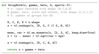 - GN은 pytorch나 tensorflow로 몇 개의 line만으로 쉽게 구현 가능하다. (아래 Tensor flow 코드)