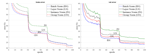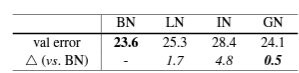 - LN과 IN등이 BN 방법보다 높은 validation set error율을 보이지만, GN은 0.5% 정도의 작은 error율 차이만 있다.