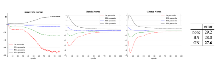 - Training set error율을 보면, GN이 더 작은 error율을 보임을 확인할 수 있는데, GN이 optimization이 더 쉽게 된다는 것을 의미한다.