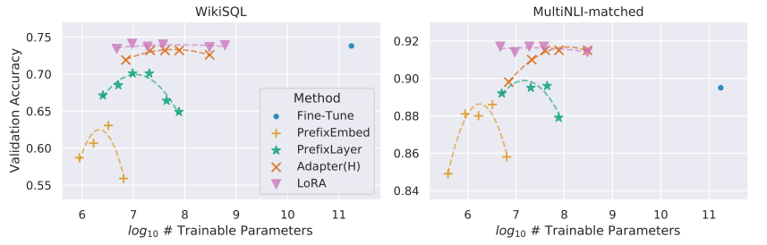 - accuracy와 학습해야 하는 parameter 수 관계를 보면, LoRA가 가장 효과적으로 적은 parameter 학습만으로 좋은 성능을 보임을 알 수 있다.
