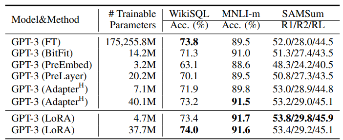 - LoRA는 매우 적은 학습 parameter와 추가적인 inference latency 없이도, 최신 LLM 모델과 비슷하거나 그 이상의 performance를 낸다.