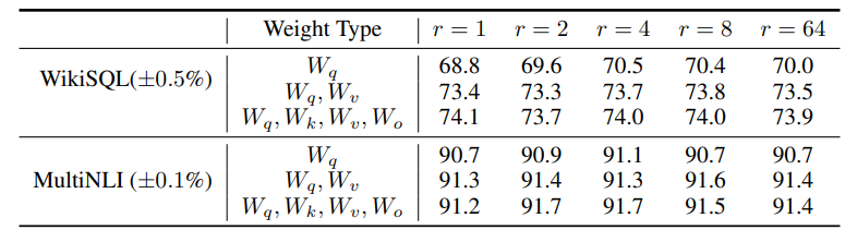 - query와 key 중 하나만 LoRA를 적용했을 때는 낮은 성능을 보인다. query와 value 둘다에 적용했을 때가 좋은 성능을 보인다.