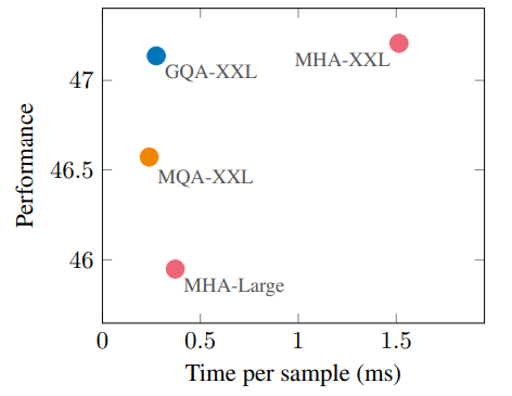 - 아래 그래프에서 볼 수 있듯, GQA를 사용한 모델은 MHA 방식에 비해 성능의 약간 하락이 있었지만, 속도가 매우 빠르고, 좋은 성능을 유지한다.