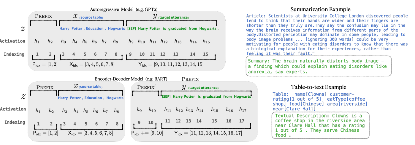 - Prefix-tuning의 실험을 위해, GPT-2에서 table-to-text 생성과 BART에서 text 요약을 실험했다.