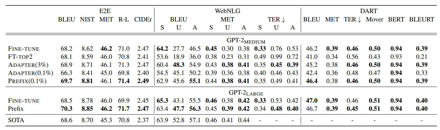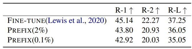 - Prefix-tuning은 다른 lightweight tuning 방법보다 좋은 performance를 달성했고, fine-tuning에 버금가는 좋은 성능을 보였다.