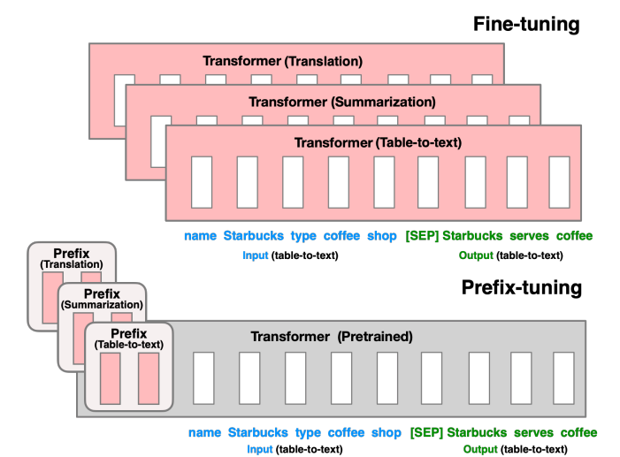 LI, Xiang Lisa; LIANG, Percy. Prefix-tuning: Optimizing continuous prompts for generation. arXiv preprint arXiv:2101.00190, 2021.