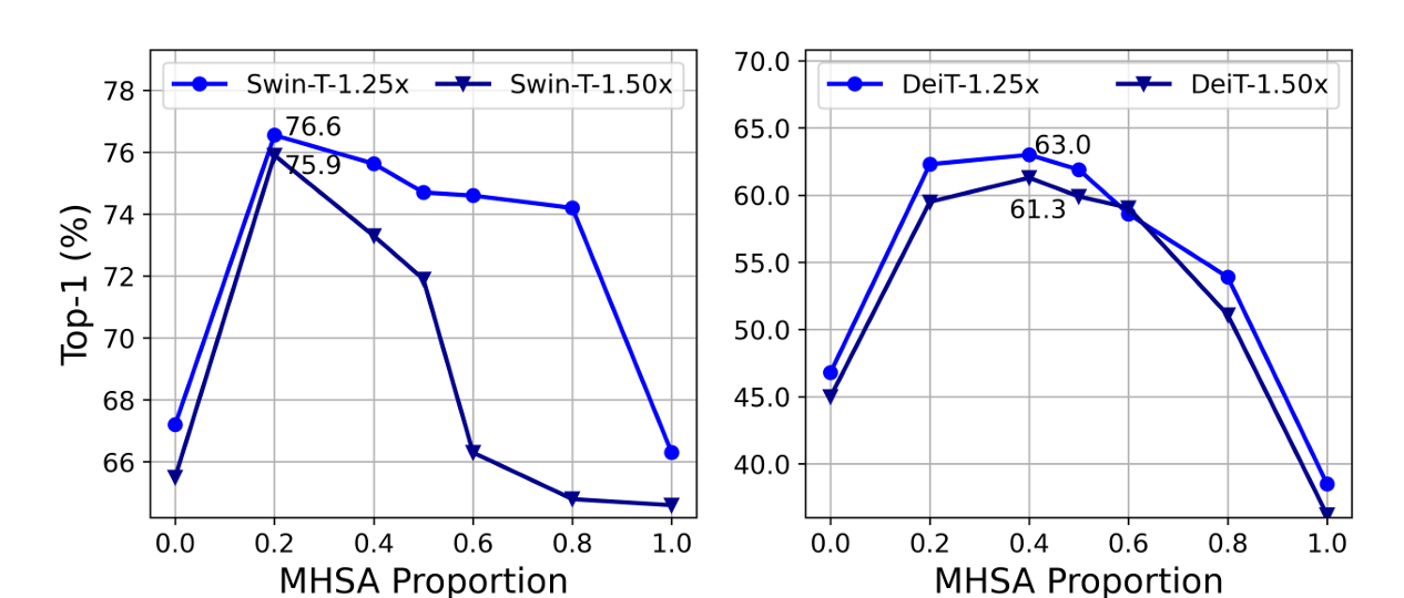 - 논문에서 Swin-T, DeiT-T로 실험해 보았을 때, MSHA의 비율을 20~40%로 줄였을 때, 좋은 성능이 나오고, 속도로 각각 1.25배, 1.5배로 빨라졌음을 확인했다. (아래 그래프 참고)