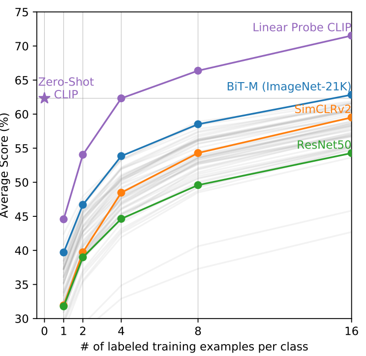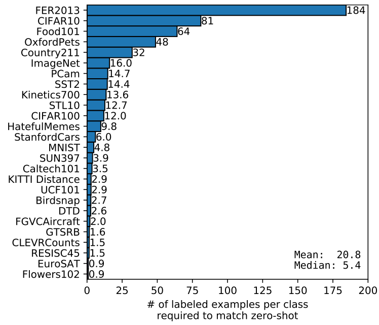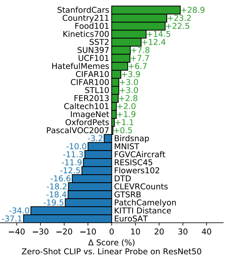 - 이 방법의 효과성을 입증하기 위해, 30개 이상의 Computer vision 데이터셋 대상으로 벤치마킹을 수행하였다. 그 결과, 각 데이터셋에 대한 학습 없이도, 해당 dataset으로 학습한 모델들과 필적할만한 좋은 성능을 보였다. (ex. ResNet-50 ImageNet에서 비슷한 성능)